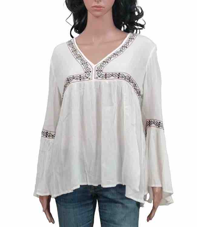 Ladies viscose crepe woven tops. Long sleeve. Has embroidery